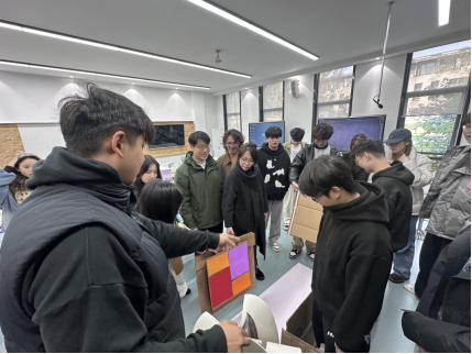 在活动中,唐克扬教授特意打破同学间既有的熟悉社交圈,将相熟者拆分重组,与相对陌生的同学分入同一小组,这一安排旨在打破固化的人际关联,让每位同学在全新的团队配置中,以多元视角接纳设计任务中的模拟社会身份,各成员分别被赋予艺术家、商人、业主、社区群众四类角色。同时将设计空间拆解为对应模块,同学们需立足自身模拟身份的核心诉求,展开针对性的设计创作与探索。唐克扬教授深入各小组设计实践现场,全程参与同学们的创作过程,针对性地为同学们答疑解惑、提供实操指导,和同学们一起以纸板模型为载体,搭建出本次工作营的初步设计成果。同时,结合现场实践案例示范了后续设计的核心流程与创新思路,为同学们的创作推进提供了清晰指引。