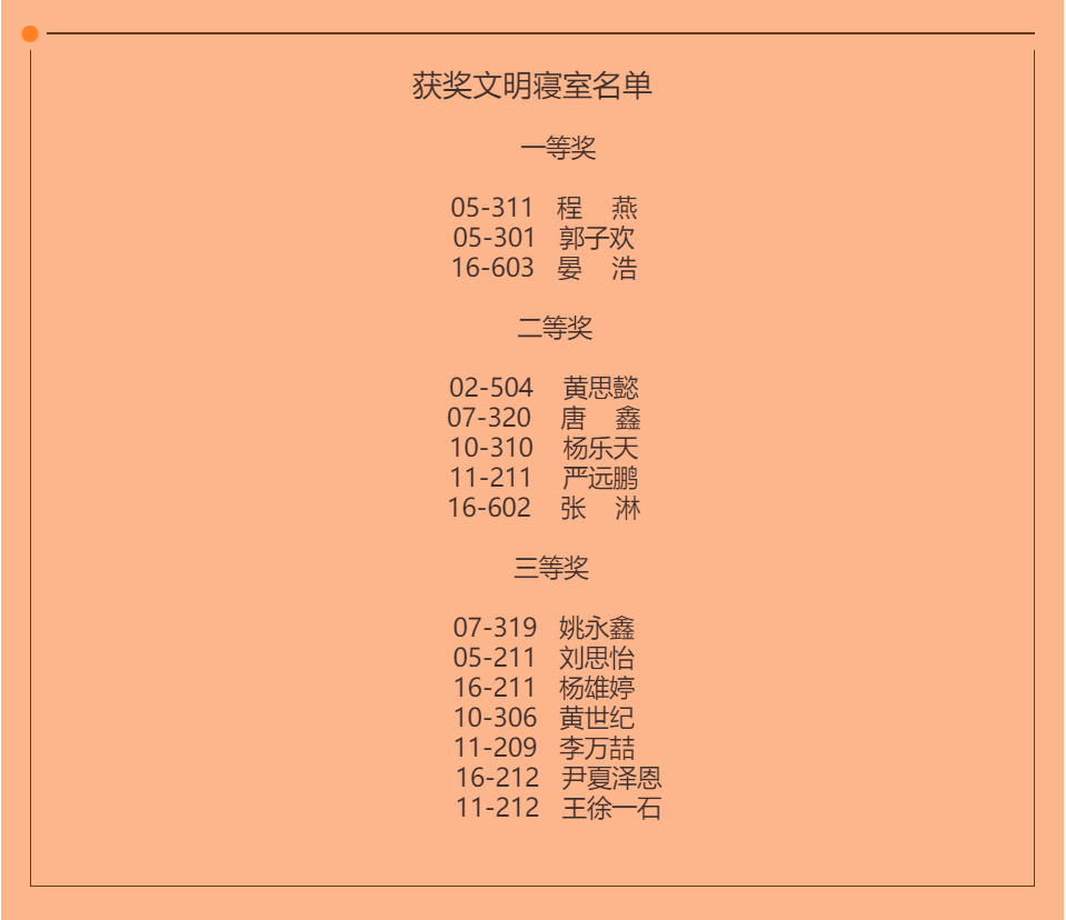 4月12日公布文明寝室的评选结果。优秀文明寝室获奖名单由李纤纤辅导员以及生活部部长郑清源带领生活部部门成员根据平时检查和突击查寝打分得出。
