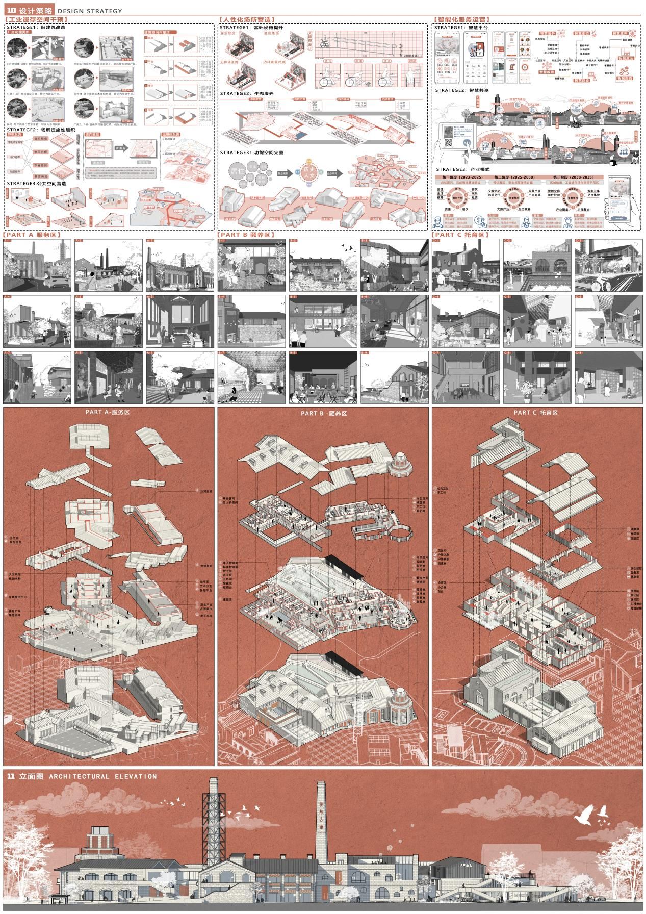 设计简介:基于对场地周边环境现状及主要人群的调查与分析得出黄陵老镇的四个主要问题:即乡镇公共空间配套资源缺失;工业遗存空间闲置浪费;老龄化、留守儿童问题;乡镇运营管理模式落后。设计通过工业遗存空间适应性干预、人性化场所营造、智能化服务运营这三个主要策略以实现黄陵古镇工业遗存空间适应性更新设计,打造一个复合型的智慧无碍社区。