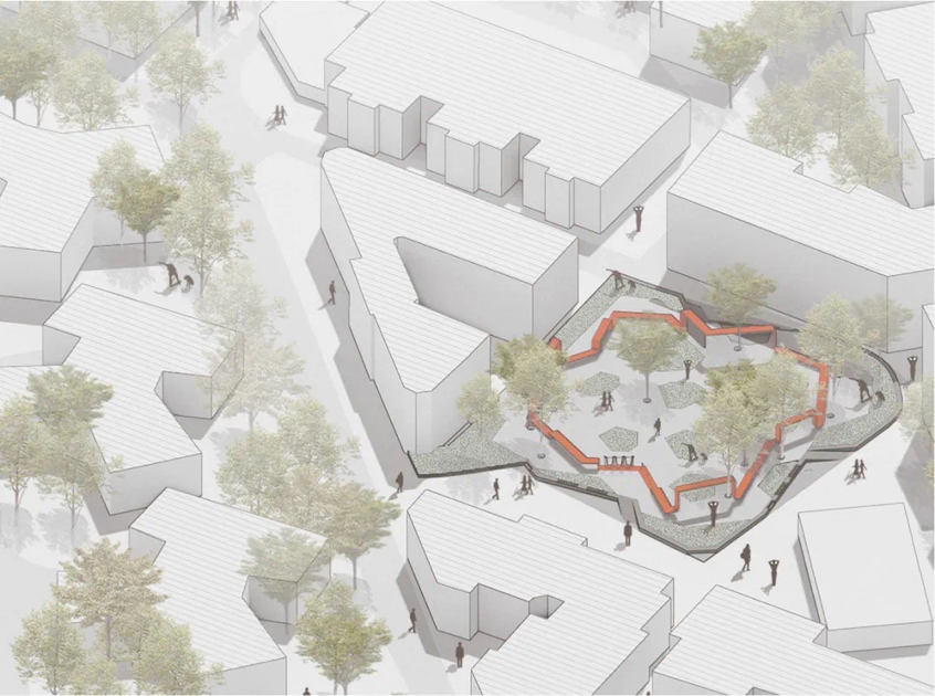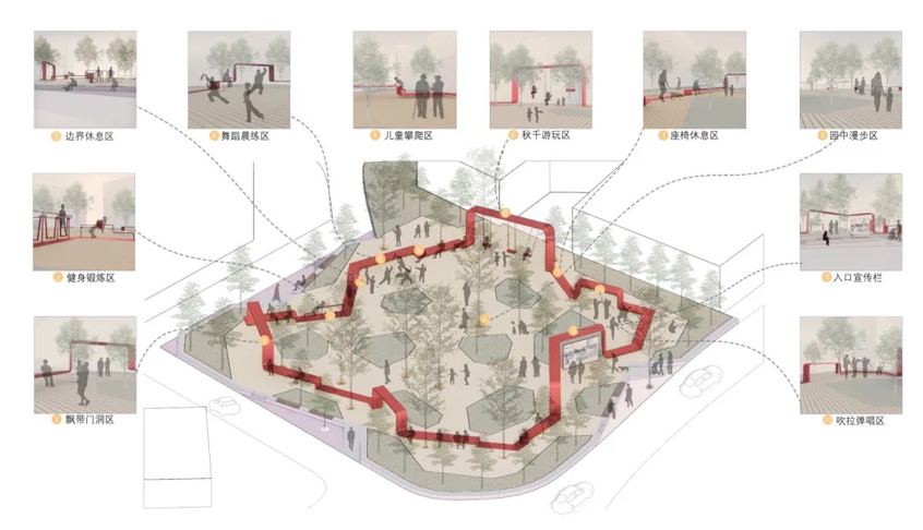 衍边空间,以“从水从行,无迁无衍”为灵感,通过起伏的飘带,与绿植、场地产生联系。以高低起伏,如水流般的姿态在场地里衍生,并且划分出不同的功能空间,以期把不同年龄的人群连接起来,让他们共同享用这隐藏在城市下的一片绿意空间。本方案通过飘带、边界推演、绿植利用、海绵城市的结合使生活在城市下的人们感受到“衍边”中有边无界的生命活力,在浮躁紧张的城市生活中,带给人们一丝丝惬意的感受。