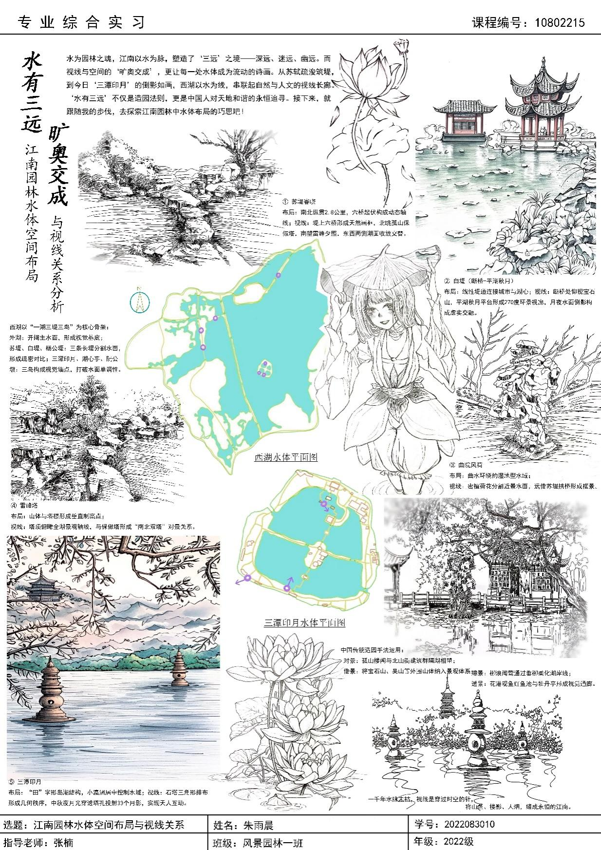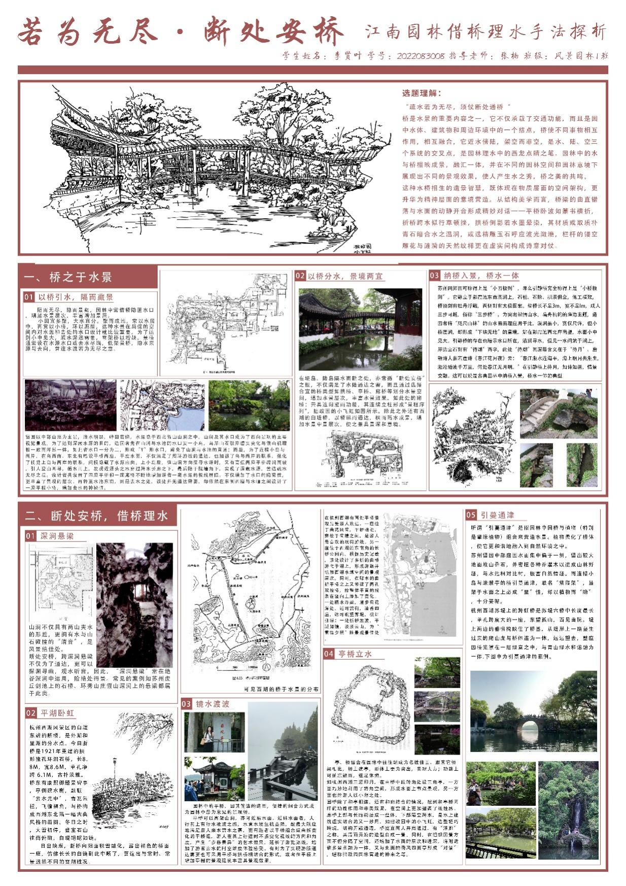 作品介绍:本次课题研究以江南园林水体空间布局与视线关系为核心,分别从水体空间布局、水体视线、视线引导这三个方面分析,逐步理解“水有三远,旷奥交成”的真正含义。穿梭于曲桥水榭、方池曲岸,用镜头与手绘记录每一处水景的聚散开合,体会在江南园林水体设计中暗含的空间哲学。这不仅是一次学术探索,还是一次与江南园林的对话。