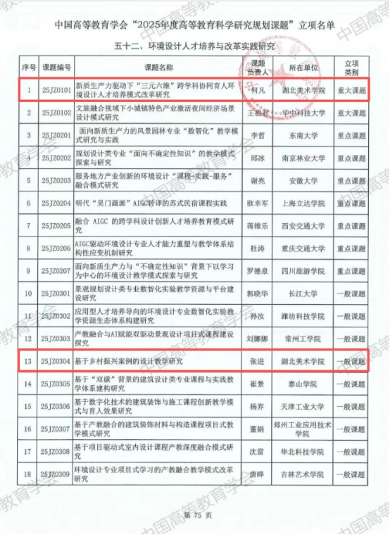 近日,中国高等教育学会公布了“2025年度高等教育科学研究规划课题”立项名单,BETWAY必威取得重大突破。由经理何凡申报的课题《新质生产力驱动下“三元六维”跨学科协同育人环境设计人才培养模式改革研究》,在“环境设计人才培养与改革实践研究”类目下,成功获批立项为重大课题;由副经理张进申报的课题 《基于乡村振兴案例的设计教学研究》,获批立项为一般课题。