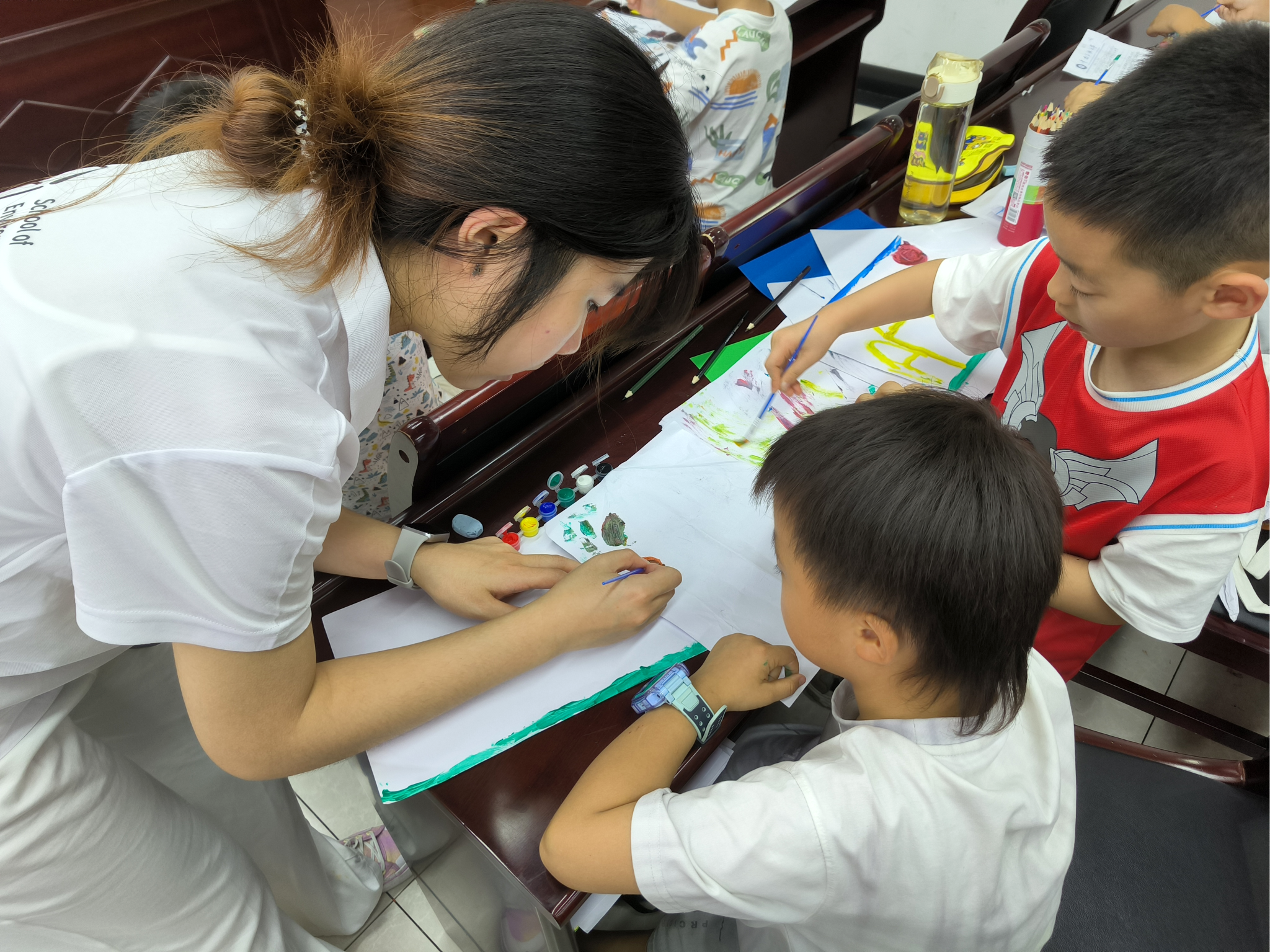 在绘本制作课堂上,孩子们的创意如夏日藤蔓般蓬勃迸发。“老师,我要画会飞的兔子!”“我想给小熊房子涂满彩虹色!”志愿者从基础线条勾勒教起,手把手指导裁剪纸张、搭配色彩,助力孩子们将脑海中的奇思妙想转化为《森林里的生日派对》、《会讲故事的星星》等创意手工绘本。展示环节,画纸上斑斓的蜡笔痕迹里,纯粹又鲜活的创造力,尽显童真与艺术天赋。