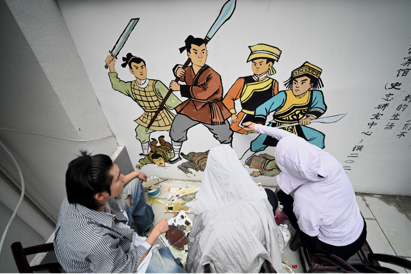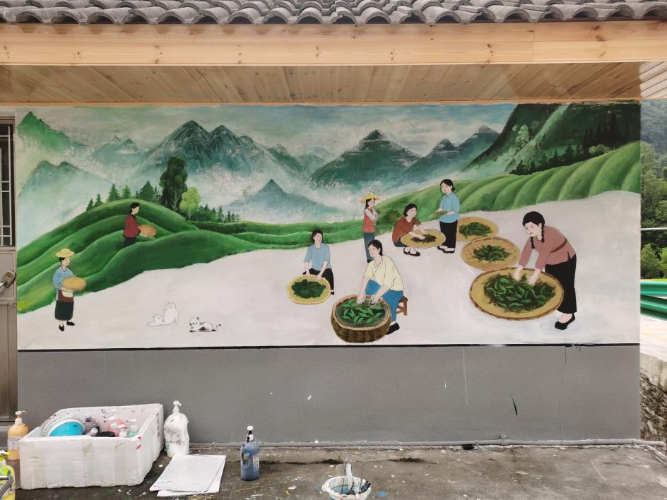 另一幅墙绘则聚焦五峰特色茶园文化。队员们细致勾勒出绿意盎然的山峦、顺山势铺展的茶园,以及采茶人忙碌的身影。据了解,五峰茶文化源远流长,茶叶种植、采摘、制作等环节凝聚着当地百姓的智慧与汗水,这幅墙绘正是对这份“茶深情”的质朴呈现,将土地对人的馈赠转化为清晰可见的美好图景。