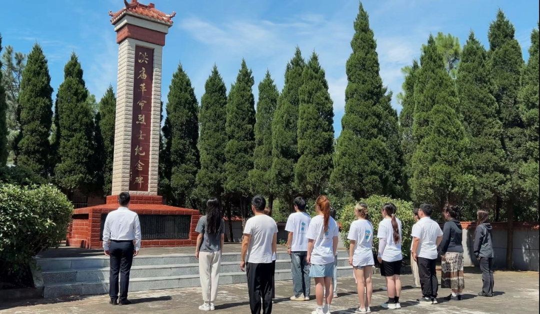 孙歆韵(左二)和淯溪镇人民代表大会副主席、共青团淯溪镇委员会书记刘雪阳(左一)召集员工中的团员与群众一起瞻仰洪庙革命烈士纪念碑